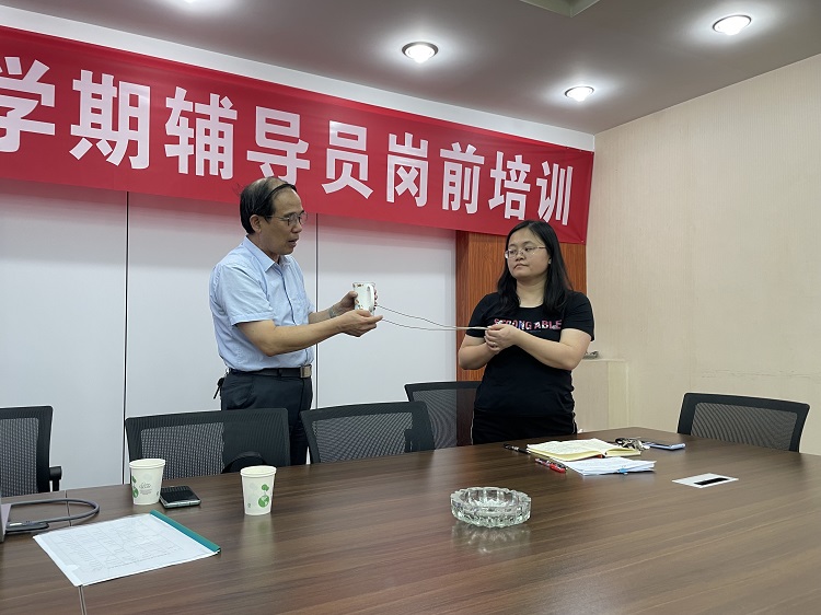 深蓝学院学工办主任秦向荣就辅导员职业形象塑造展开主题分享,在互动中提出“心中有敬意,行为有表达”的主题思想,强调辅导员职业形象的重要性。她还邀请新生辅导员上台出,采用情景模拟的方式对以上问题进行了综合演练。