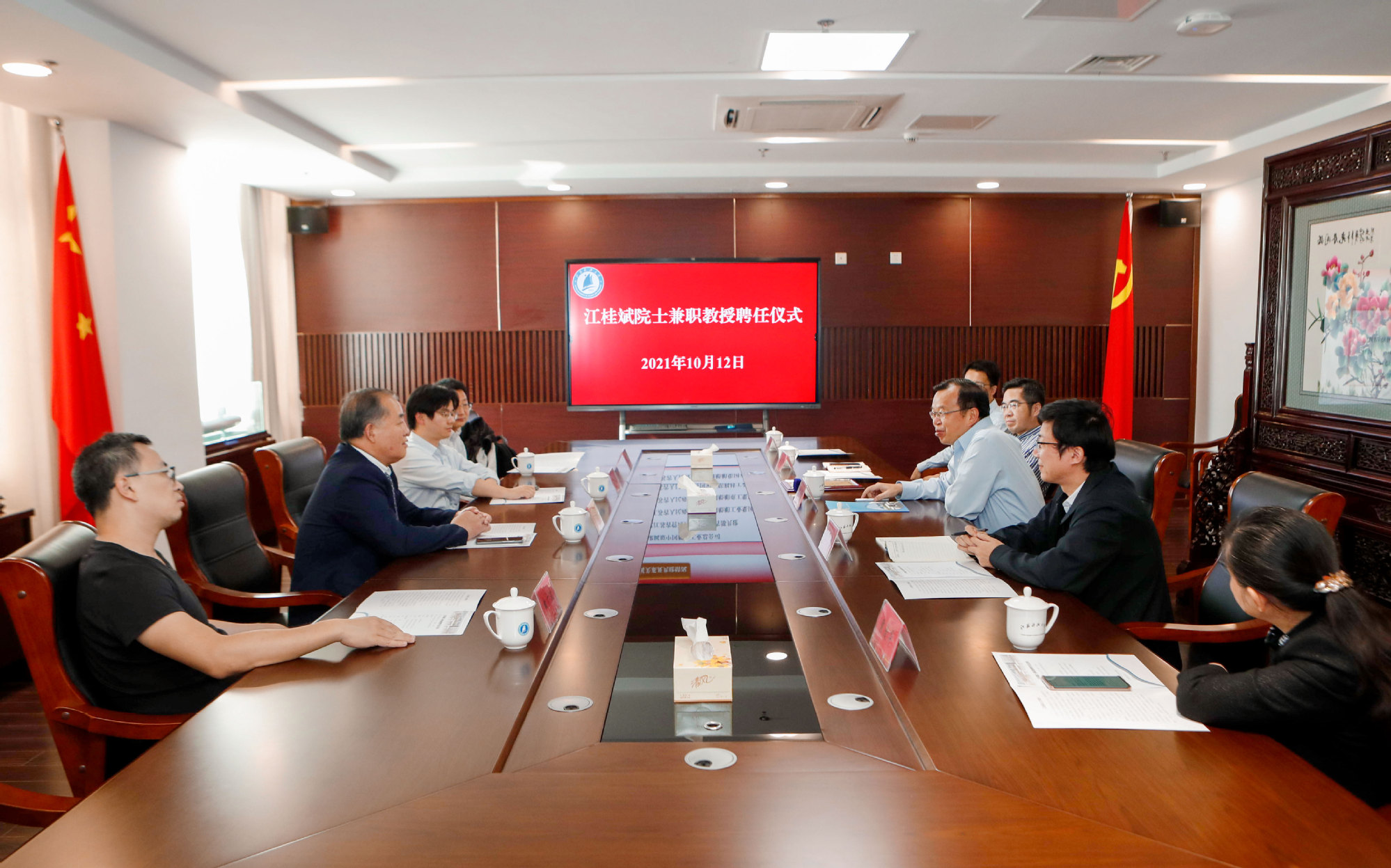 当天江桂斌院士还受聘成为了必赢bwin官网登录入口兼职教授。周南平校长向江院士介绍了学校整体办学情况并为其颁发了兼职教授聘书。双方同意将在环境学科发展和平台建设等方面展开深度合作。中国科学院生态环境研究所傅建捷研究员、曲广波研究员、校办主任李强天、人事处处长朱志宇、环境与化学工程学院院长袁爱华、书记徐文睿参加了仪式。会后,周南平校长等人陪同江桂斌院士一行参观了环境与化学工程学院实验室,并与学院领导、师生开展了深入的交流。