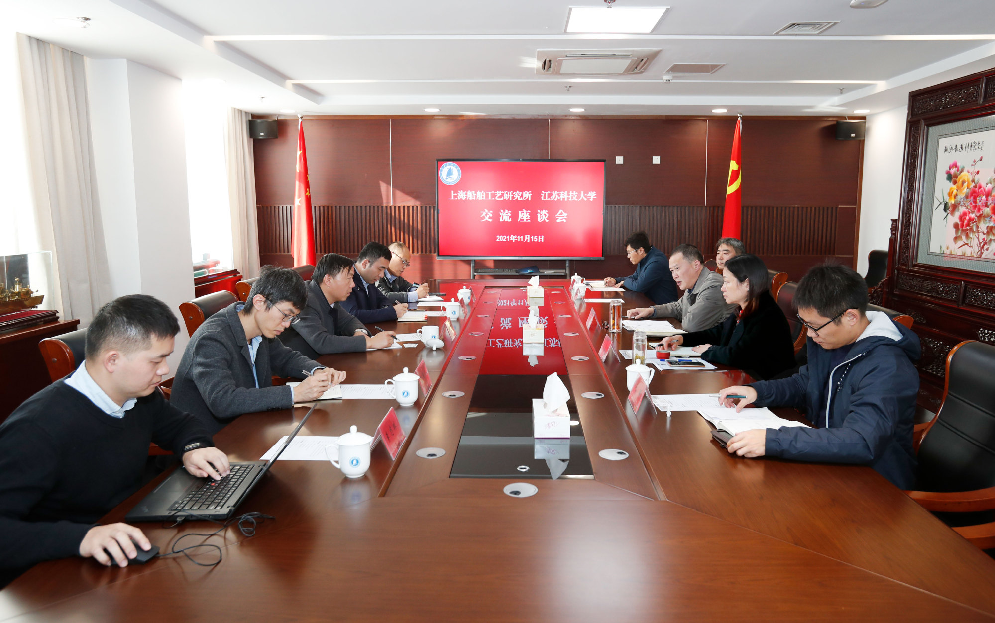 汤建副校长对杨润党副所长一行的到来表示热烈欢迎,并从学校办学历史、办学特色、学科、科研、师资、教学等方面简要介绍了学校的基本情况,汤建副校长表示学校正朝着国内一流造船大学目标奋力前行,对上海船舶工艺研究所长期以来为江科大提供的支持和帮助表示衷心感谢。