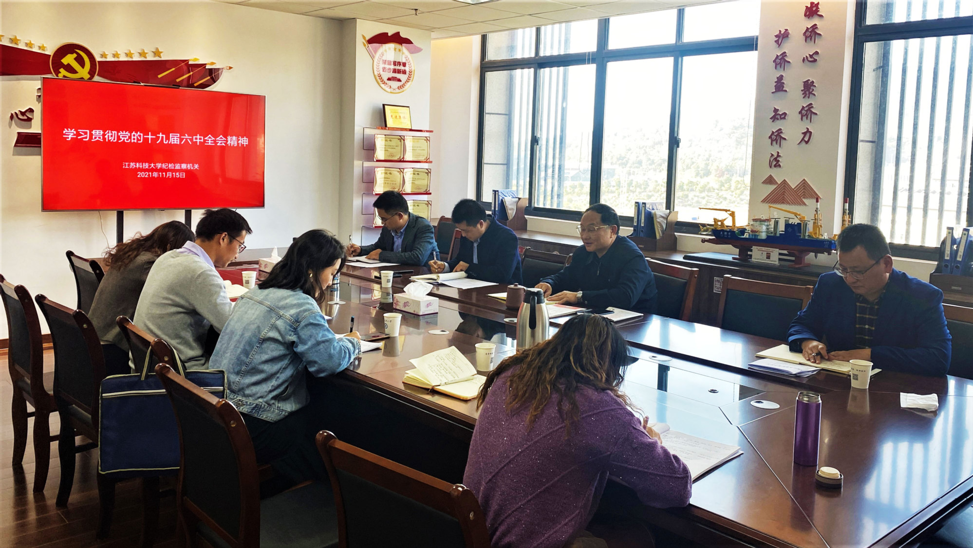 11月15日下午,校纪检监察机关在行政楼八楼会议室召开部门工作会议,专题传达学习党的十九届六中全会精神,校党委常委、纪委书记、派驻监察专员郑培钢出席并讲话。会议由校纪委办公室主任刘占超主持,全体专职纪检监察干部参加。