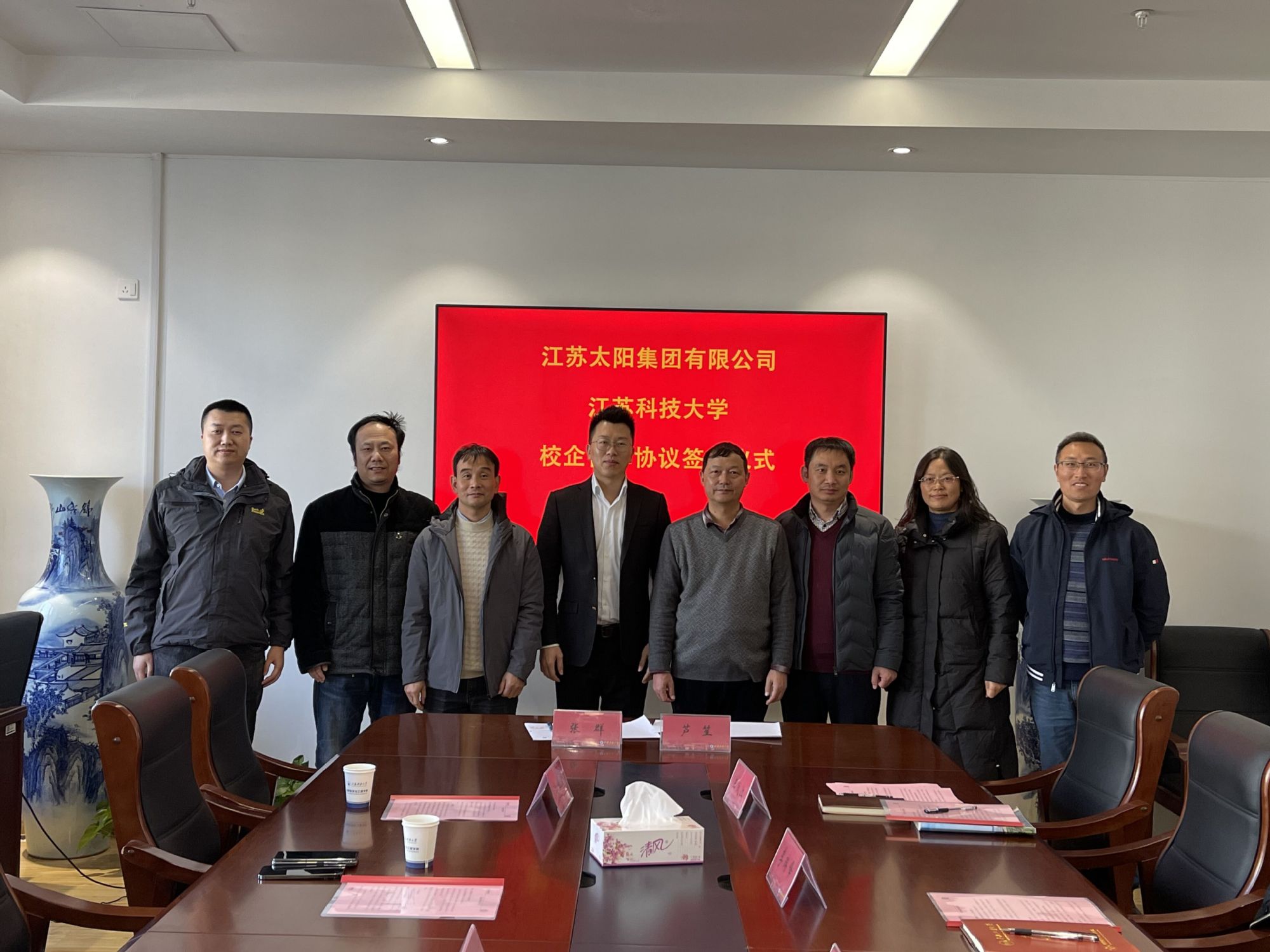12月3日,材料科学与工程学院与江苏太阳集团有限公司在材料学院会议室举行校企合作签约仪式。材料学院院长芦笙,副院长李瑞峰、陈书锦,副书记赵莉,功能材料系主任王凤江,以及太阳集团总经理张群、运营总裁黄奉康、研发部经理刘瑞鸿、人事部经理蔡德忠等出席。