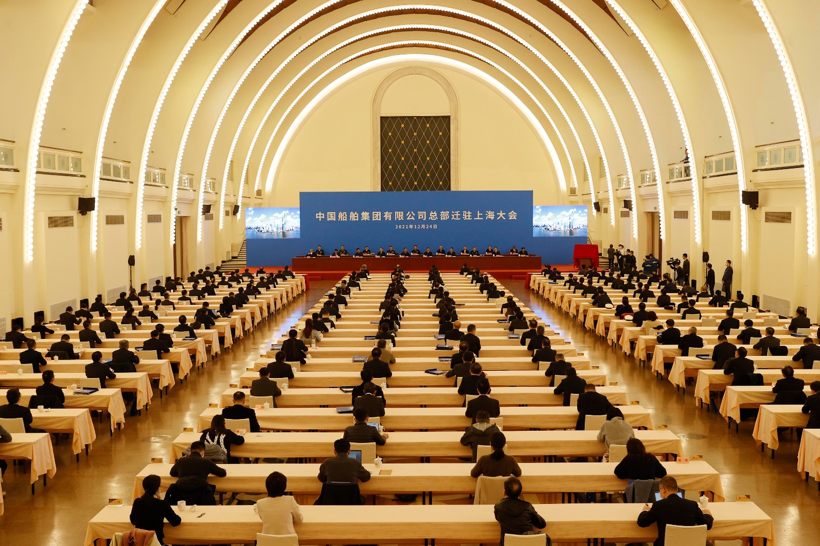 12月24日,中国船舶集团有限公司总部迁驻上海大会在沪举行。上海市委书记李强、国务委员王勇出席并为迁驻后的“中国船舶集团有限公司”揭牌。国务院国资委党委书记、主任郝鹏,上海市委副书记、市长龚正,中国船舶集团党组书记、董事长雷凡培出席并讲话。中国船舶集团党组副书记、总经理杨金成主持揭牌仪式。必赢bwin官网登录入口党委书记葛世伦代表学校参加大会,见证了中国船舶工业重要的历史时刻。