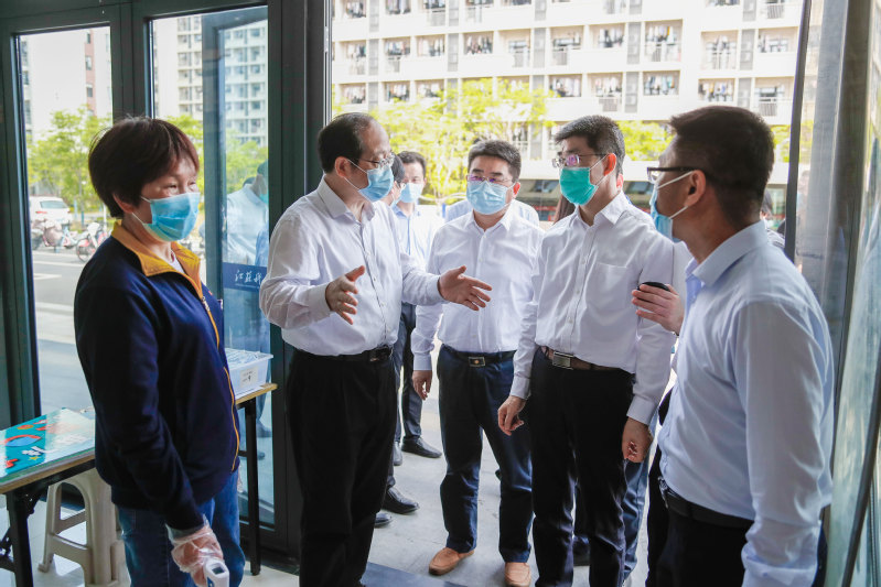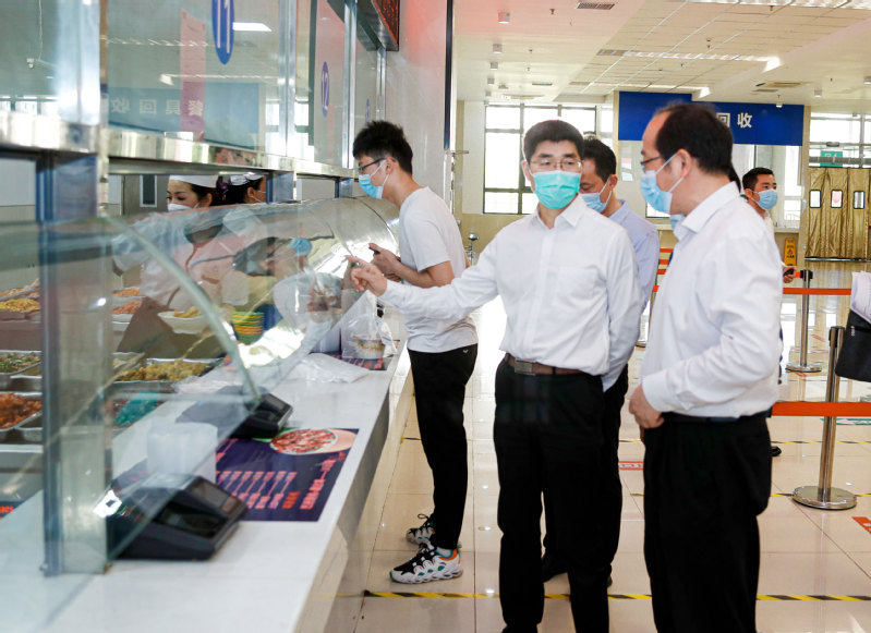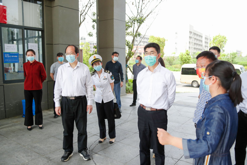 薛国荣一行首先来到梦溪校区,前往学校大门、核酸检测现场、学生公寓,检查了门禁系统、校门管控、全员核酸检测及学生公寓疫情防控情况。随后,在长山校区检查西苑食堂、快递中心、集中医学观察区,以及物资储备等情况。