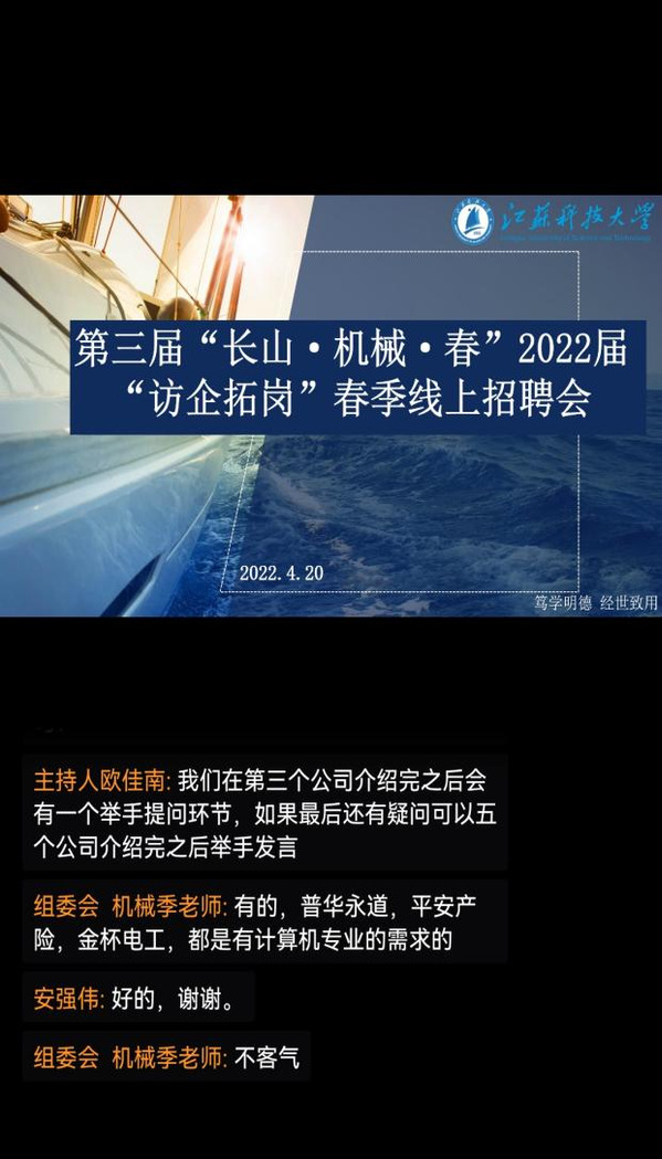 学院层面的服务各具特色。船海学院4月1日联合“广船国际有限公司”“上海外高桥集团股份有限公司”“江苏新扬子江造船有限公司”等多家企业在线举办2022年春季船舶专业线上专场招聘会;能动学院于4月2日联合“中国电子建设第二工程有限公司”“南京天加环境科技有限公司”“青岛海信日立空调系统有限公司”等9家用人单位开展能动专场线上招聘会;外国语学院3月举办了“语你同行 职为你来”求职经验线上分享会暨宣讲会,邀请优秀毕业生进行外贸行业、跨专业行业求职经验分享;经济管理学院联合“惠龙易通国际物流股份有限公司”“密尔克卫化工供应链服务股份有限公司”“诺得物流股份有限公司”“南京钢铁联合有限公司”四家企业开展“校企云端实习”线上实习教学活动,促进2023届毕业生就业工作的开展。机械学院于4月19日举办第三届“长山·机械·春”2022届毕业生春季线上招聘会,联合京东方科技集团、南高齿集团,普华永道,中国平安产险等10家优质公司,类型涵盖世界500强、大型国企、上市公司等各自类型,为毕业生与用人单位提供精准对接、高效服务。