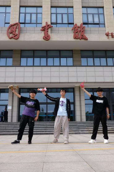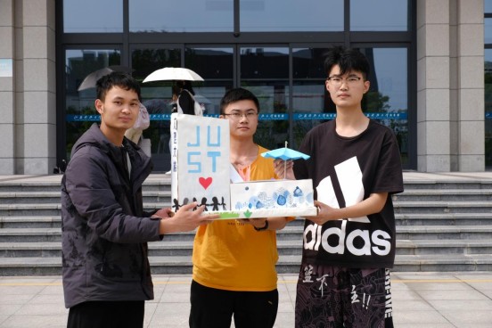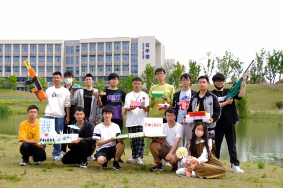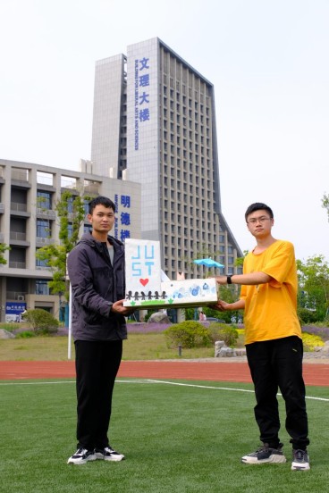 5月15日,部分团队逐步完善好作品相约于美丽的江科大校园进行打卡留念。20级高分子专业的杜昊、龚晓良、袁朝义等同学利用废旧纸箱,泡沫板打造出一个迷你版“文理大楼”通过彩绘并贴上“I LOVE JUST”的标签,表达对学校最诚挚的热爱;潘佳乐和乔湛钊两位同学带着完善后的迷你版图书馆到校图书馆打卡,希望同学们能在江科大探索真知,展现青春活力,享受大学生活;吴齐用折纸和泡沫制作出“JUST号”舰船,他表示“JUST号”不仅仅是一艘船,更是承载着自己四年的梦,希望它能带着自己驶向深蓝;而张康、宗剑伟、董舒则带着各自制作的飞机畅游在校园进行打卡。随后,全体成员分别在文体中心、图书馆、笃学楼、材料学院等地合影留念。