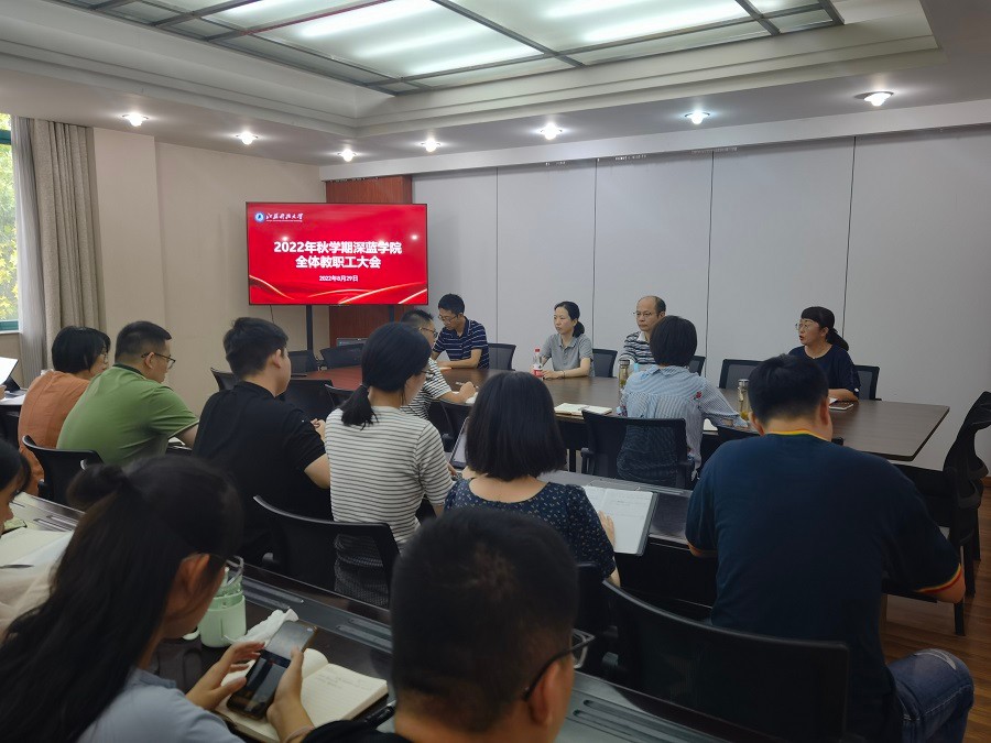 8月29日上午,深蓝学院召开2022年秋学期首次全体教职工大会。校党委常委、副校长任南出席会议,听取学院新学期工作安排和部署,并就辅导员如何更好引领学生成长成才提出要求。学院党总支书记、院长杨建超主持会议。