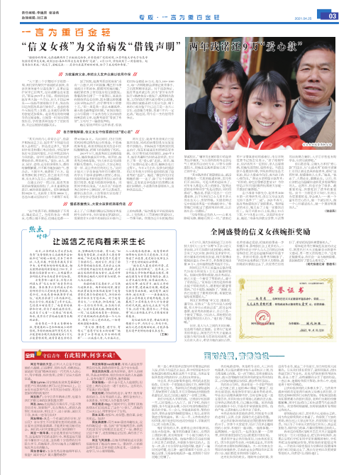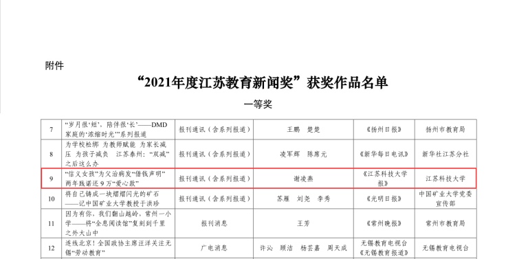 “2021年度江苏教育新闻奖”评选日前揭晓,由《必赢bwin官网登录入口报》原文刊登并推荐报送的作品《“信义女孩”为父治病发“借钱声明”两年践诺还9万“爱心款”》(作者:谢凌燕,原载于2021年4月25日《必赢bwin官网登录入口报》第802期)获得一等奖,这是学校校报作品首次获得“江苏教育新闻奖”一等奖,也是全省高校校报唯一的一件一等奖作品。