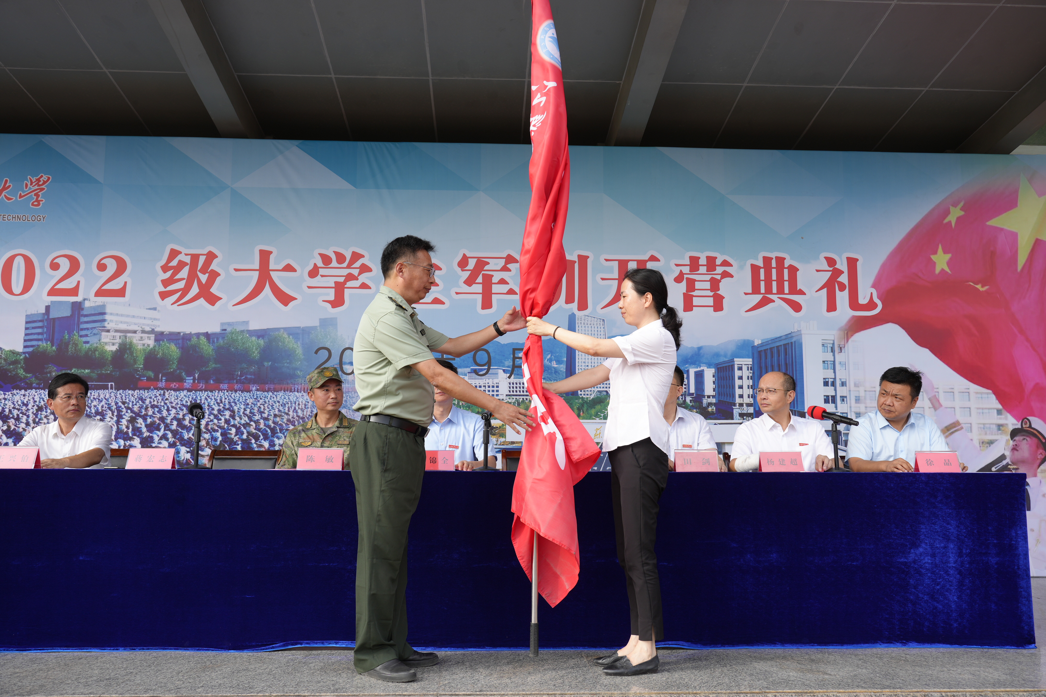 开营仪式上,部队教官们首先给同学们展示了队列基础动作和军体拳,赢得了同学们的热烈掌声。在雄壮的国歌声中开营仪式正式拉开帷幕。人民武装部部长蒋宏志宣布必赢bwin官网登录入口2022级大学生军训旅编成命令,军训旅下设16营,27个连,蒋宏志任旅长,杨建超任政委。副校长任南授军训旅旗,蒋宏志接旗并为各营授营旗。
