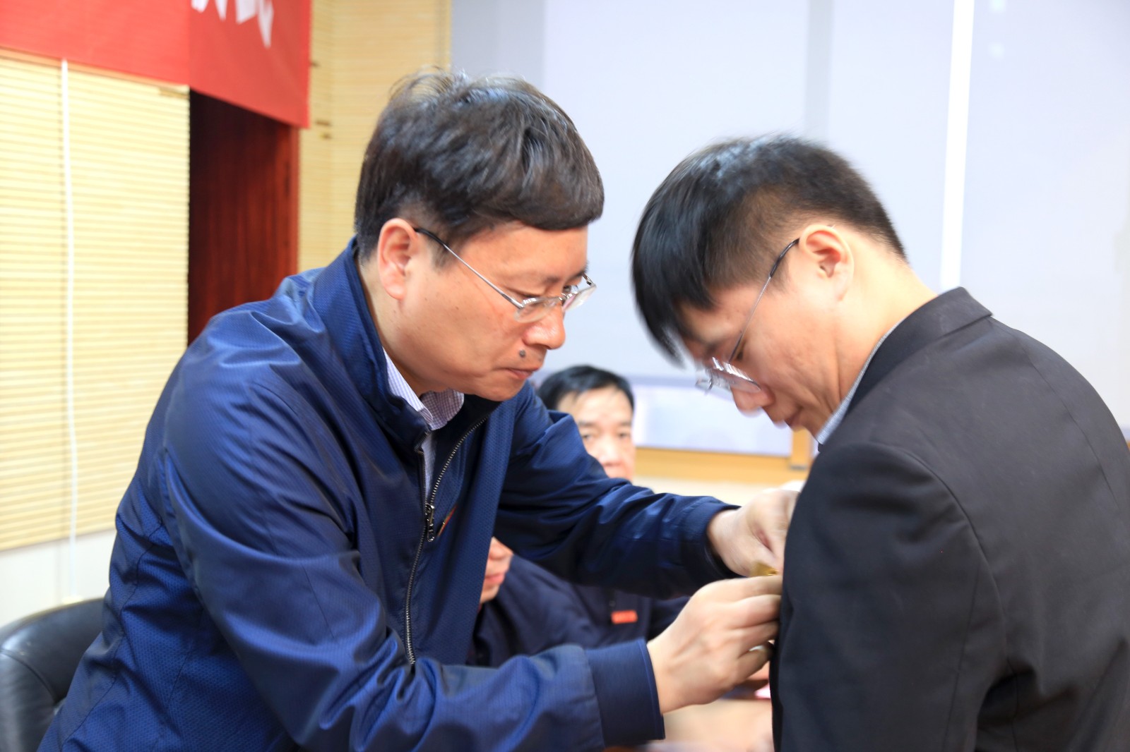 朱志宇介绍了人事部门工作职责,并表示将竭诚为今后新老师的职业生活发展做好服务工作。潘锦全为新教师代表孙桂磊颁发校徽。