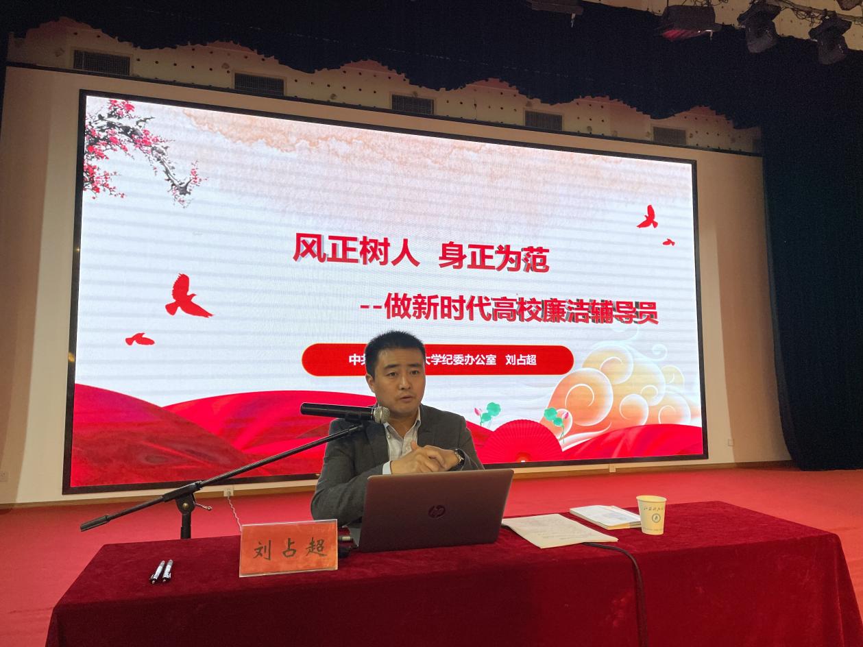 此次培训,刘占超围绕明晰形势,坚持自我革命;牢记初心,一脉相承从严治党;身正为范,立心筑魂为党育人三个主题展开。首先,刘占超结合党内腐败案例,帮助大家深刻认清当前反腐败斗争的复杂形势,提醒大家全面从严治党永远在路上,反腐败斗争一刻不能停。随后,刘占超将教育的初心使命与全面从严治党的要求相结合,强调辅导员是教育者、管理者、服务者,更是行为的示范者。作为高校辅导员,一定要遵守高校教师职业行为规范,牢记中国共产党的六大纪律,自觉规避辅导员岗位的廉政风险点,做一名讲道德、重操守、严纪律的廉洁辅导员。最后,刘占超叮嘱在座辅导员在工作中要严守职责边界,坚定理想信念;坚守党纪党规,强化法纪遵从;坚持立德修身,强化人格感召,做一名新时代廉洁辅导员。