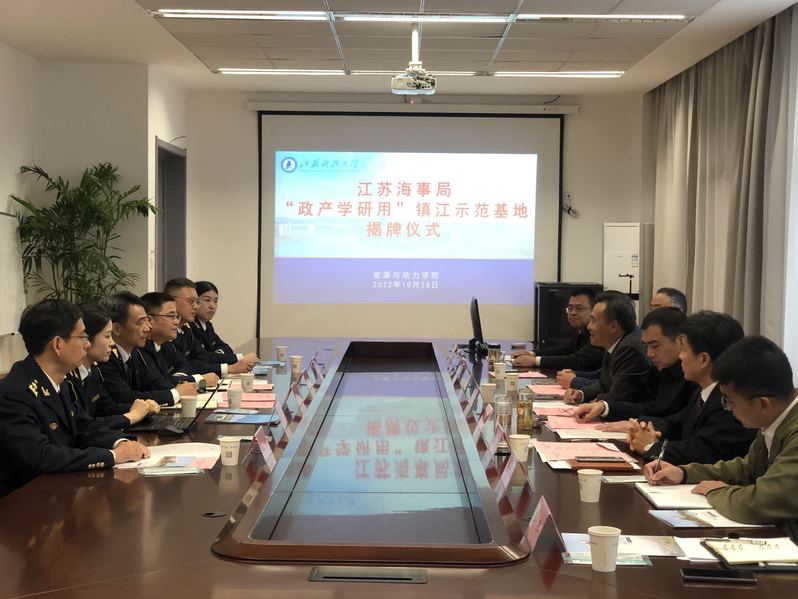 10月28日,江苏海事局与必赢官网举行首家海事履约研究“政产学研用”镇江示范基地揭牌仪式。必赢bwin官网登录入口党委副书记、副校长景旭文,江苏海事局法规规范处处长费中强、调研员周羽,镇江海事局政委周卫东、执法督察处处长陈兴、党工部主任王飞、执法督察处主办范亚晶,学校对外合作处处长王荣、科技处副处长张建、能动学院领导班子成员及相关人员参加揭牌仪式并座谈交流。能动学院党委书记温华兵主持。