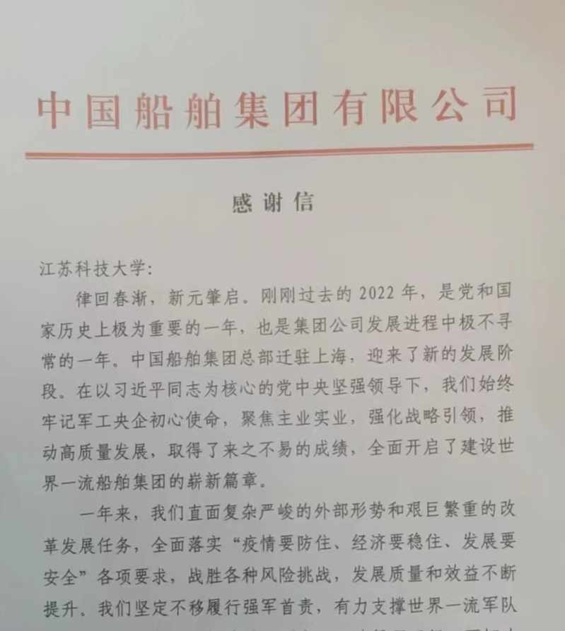 1月16日,必赢官网收到来自中国船舶集团有限公司的《感谢信》,衷心感谢学校长期以来特别是2022年对中国船舶集团有限公司取得的一系列不平凡成绩的关心与支持。感谢信中提到,2023年是全面贯彻落实党的二十大精神的开局之年,希望双方围绕国家海洋装备领域重大战略需求,充分发挥各自优势,在船舶与海洋工程、先进制造等领域进一步深化合作,共同为全面建成社会主义现代化强国,实现中华民族伟大复兴的“中国梦”不懈奋斗!