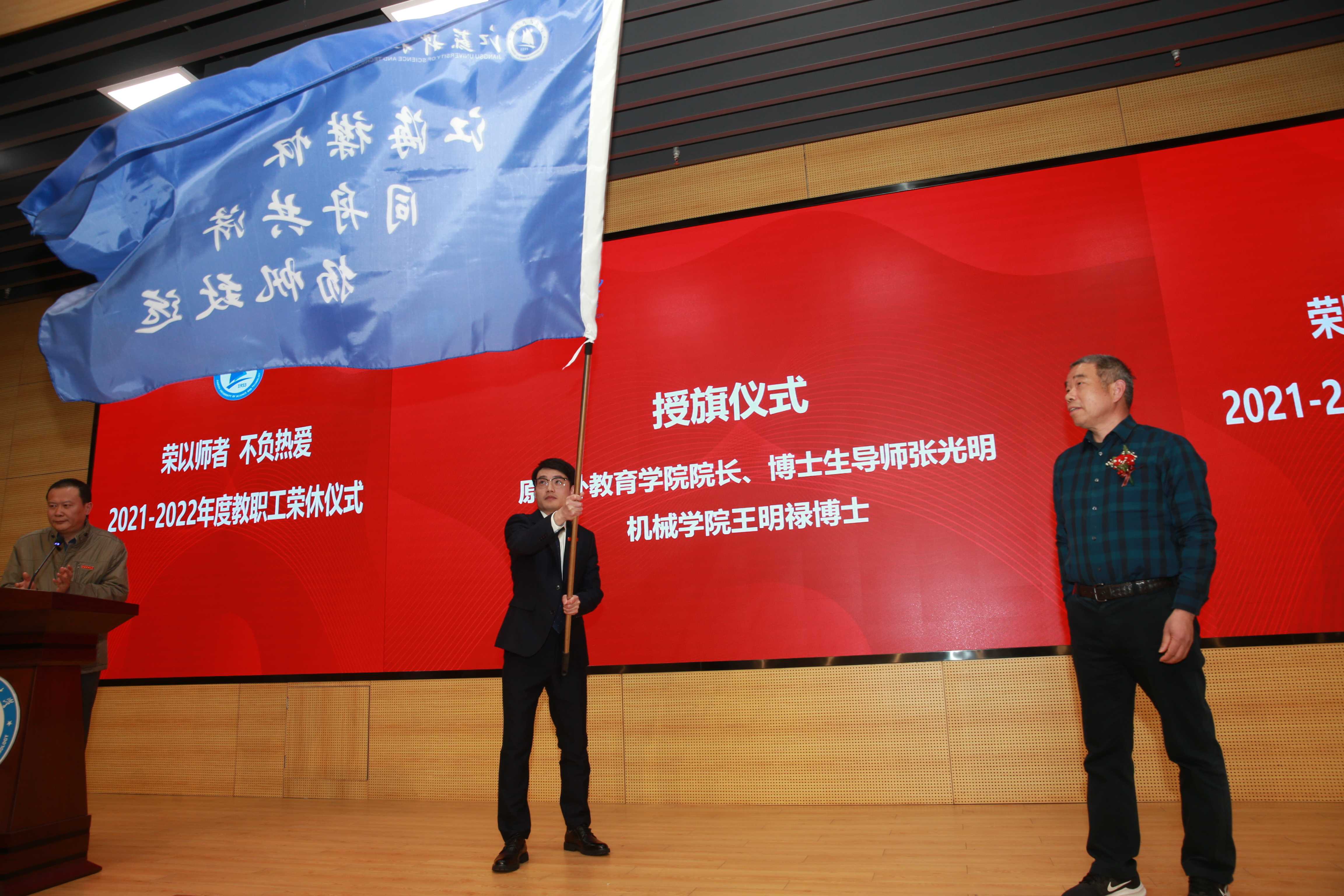 在授旗仪式环节,原海外教育学院院长张光明将旗帜郑重交给新教师代表、机械学院王明禄老师,传递与赓续学校“船魂”精神。