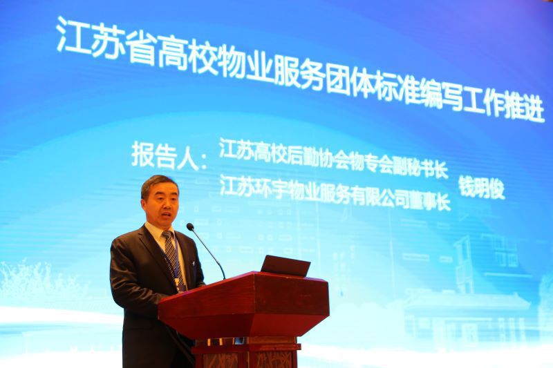 “物专会”副秘书长、江苏环宇物业服务有限公司董事长钱明俊向大会报告了江苏省高校物业服务团体标准编写工作推进情况。