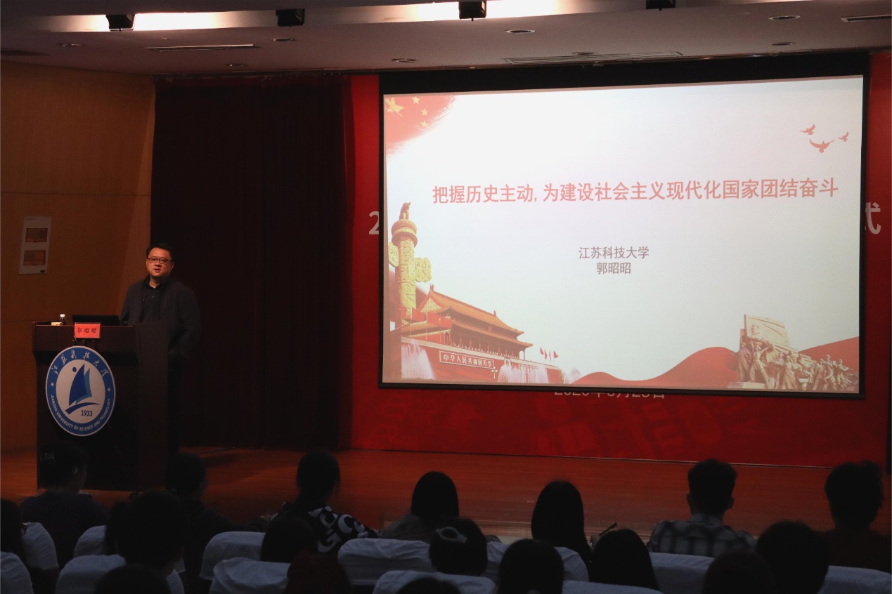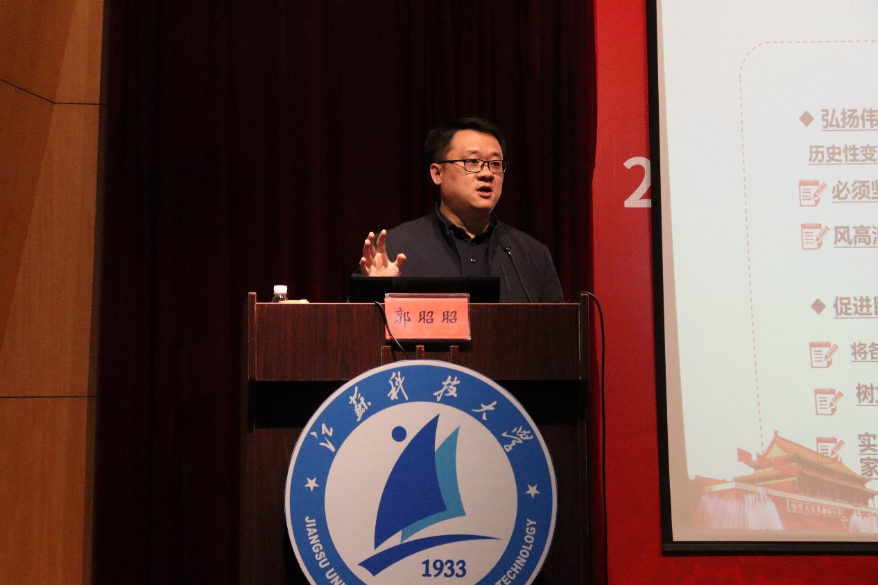 为深入学习宣传贯彻党的二十大精神,解决青年大学生关于党的二十大报告怎么学、学什么、怎样与具体实际相结合等问题,4月13日下午,深蓝学院邀请必赢官网马克思主义学院党总支书记郭昭昭研究员在梦溪校区学术报告厅开展以“把握历史主动,为建设社会主义现代化国家团结奋斗——深入学习党的二十大精神”为主题的2022级新生转型教育课第十六讲。本次课程由深蓝学院党总支副书记秦向荣主持,以线上线下相结合的形式开展,深蓝学院部分教师和新生代表200余人在现场听讲,其他师生在教室同步学习。
