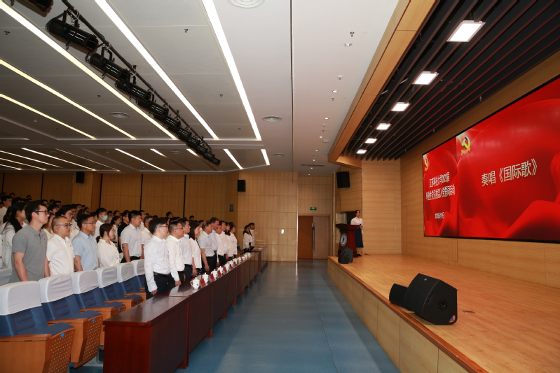 校党委副书记汤建带领全体党员重温入党誓词。党员同志面向党旗庄严宣誓,在铮铮誓言中重温入党初心,坚定理想信念,牢记责任。