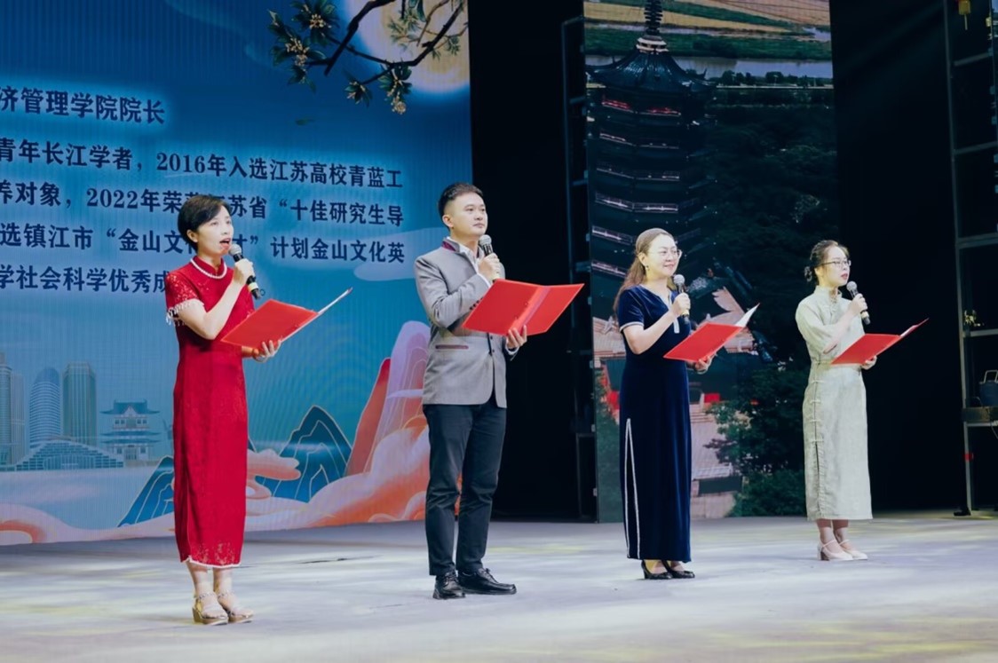 活动现场,相关领导为2023年“镇江市金山文化名家”“镇江市金山文化优青”“镇江市金山文化英才”“镇江市第六期‘169工程’学术技术新秀”等文化人才颁发了奖牌和证书。本次必赢官网教师金辉教授增补为镇江市金山文化英才。此前,必赢官网教师王念新、孟庆良教授及江雪博士获首期金山文化英才,徐兰教授获首期金山文化优青。徐兰教授受邀参加诗朗诵节目表演,与其他三位金山文化人才一起朗诵诗歌《满目俊杰,意兴飞扬》,用铿锵有力的声音,讲述镇江这座历史文化名城的古往今来。