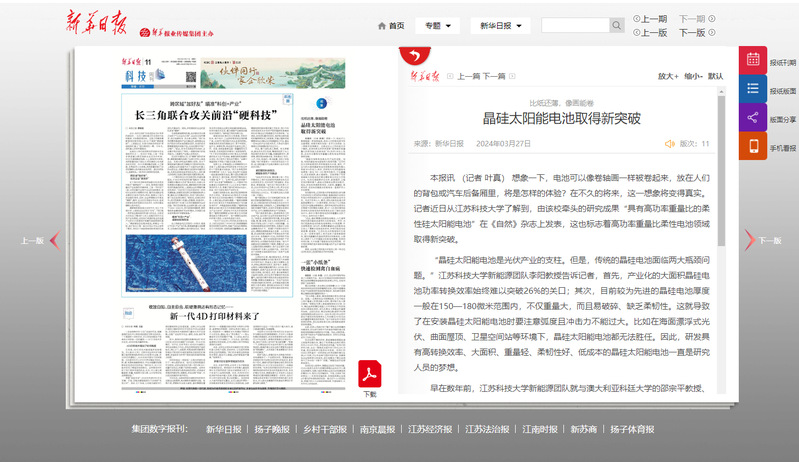 本报讯 (记者 叶真) 想象一下,电池可以像卷轴画一样被卷起来,放在人们的背包或汽车后备厢里,将是怎样的体验?在不久的将来,这一想象将变得真实。记者近日从必赢bwin官网登录入口了解到,由该校牵头的研究成果“具有高功率重量比的柔性硅太阳能电池”在《自然》杂志上发表,这也标志着高功率重量比柔性电池领域取得新突破。