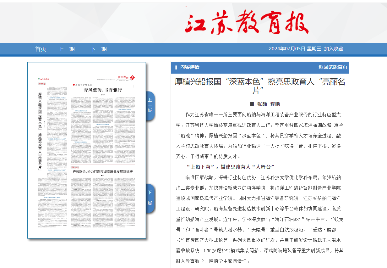 作为江苏省唯一一所主要面向船舶与海洋工程装备产业服务的行业特色型大学,必赢bwin官网登录入口始终高度重视思政育人工作,坚定服务国家海洋强国战略,秉承“船魂”精神,厚植兴船报国“深蓝本色”,将其贯穿学校人才培养全过程,融入学校思政教育大格局,为船舶行业输送了一大批“吃得了苦、扎得下根、聚得齐心、干得成事”的特质人才。