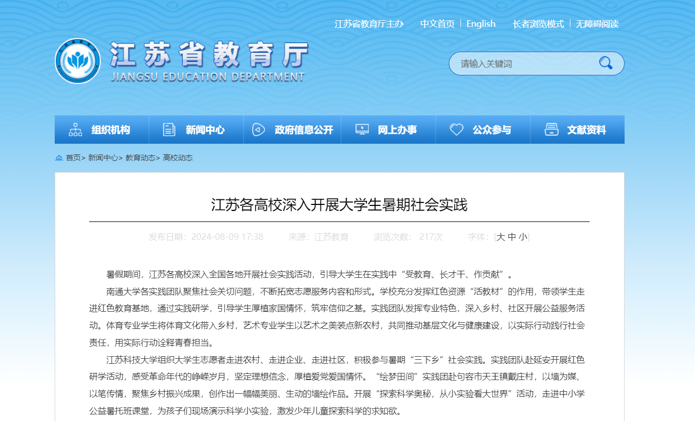 暑假期间,江苏各高校深入全国各地开展社会实践活动,引导大学生在实践中“受教育、长才干、作贡献”。