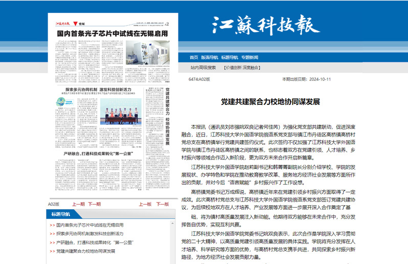 本报讯(通讯员 刘志强 姚双良 记者 何佳芮)为强化党支部共建联动,促进深度融合,近日,必赢bwin官网登录入口外国语学院俄语系党支部与镇江市丹徒区高桥镇高桥村党总支在高桥镇举行党建共建签约仪式。此次签约不仅加强了必赢bwin官网登录入口外国语学院与镇江市丹徒区高桥镇之间的联系,也标志着双方在党建引领、人才培养、乡村振兴等领域合作迈入新阶段,更为双方未来合作开启新篇章。