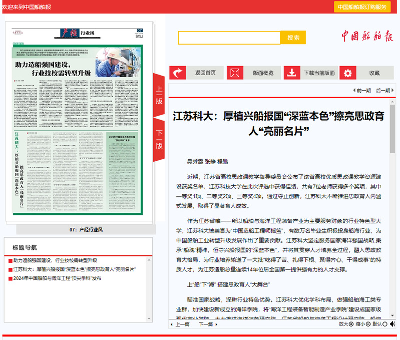 聚焦办学特色,推进思政课程与课程思政同向同行。江苏科大精心设计“精神引领+家国情怀+兴船报国”系列思政课程,编制《中国大运河科技史》《大运河镇江段文化史》等与船舶行业、地域特色相关的课程大纲,将行业特色资源、国防教育融入课程思政体系,培养学生“向海图强、爱国报国”情怀。江苏科大制作的《近现代船舶工业发展与中国崛起》作为国家在线开放课程,登录中国大学慕课平台;“精神的丰碑”主题慕课、“百年·初心”党史人物系列微课登上学习强国江苏平台;景荣春党支部爱国思政移动课堂获评江苏省“信仰公开课”示范课;学习强国、省教育厅网站多次推介该校课程思政实施成效。
